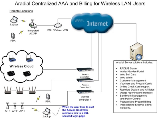 Giải pháp tích hợp được thiết kế cho sự tăng trưởng. Các giải pháp Hotspot / Wifi kết hợp bên ngoài, máy chủ Radius tập trung Aradial (không nhúng vào như là các giải pháp khác) hỗ trợ một loạt các bộ điều khiển hotspot cho phép các nhà cung cấp dịch vụ để duy trì kiểm soát càng nhiều như mong muốn qua việc sử dụng các điểm nóng trong khi triển khai mạng lưới chi phí hiệu quả và khả năng mở rộng.